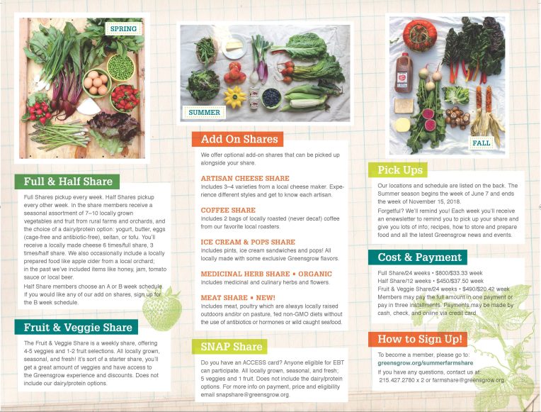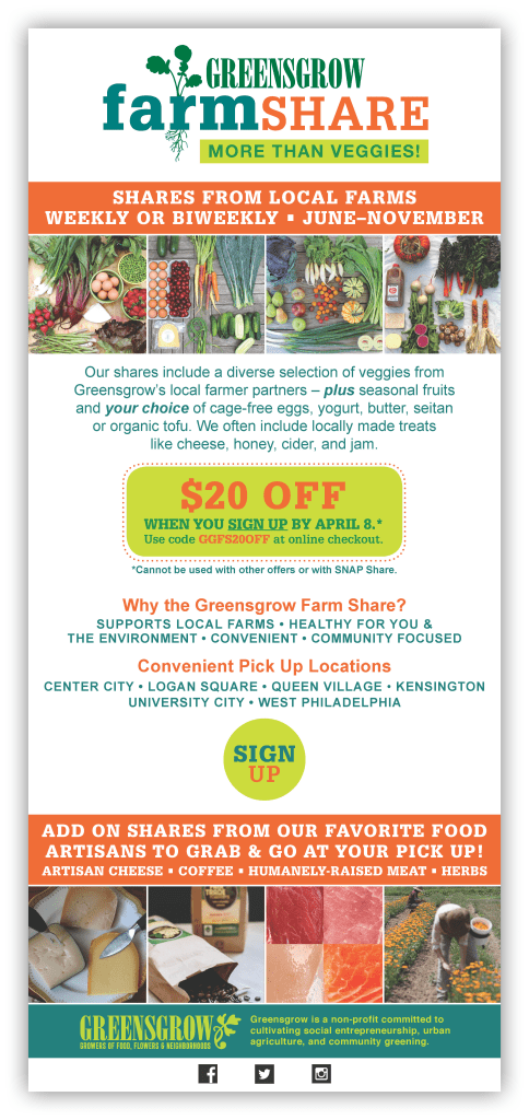Marketing pieces for the client’s farm share program. The design uses photography to focus on the product, a weekly local produce share. This is paired with a minimal collage approach to appeal to a young and green member demographic.