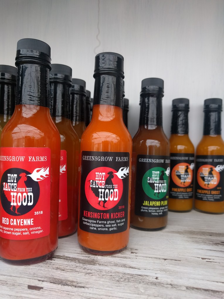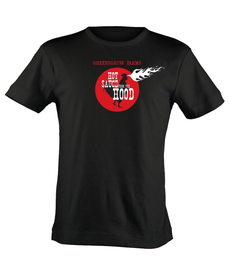 Logo, packaging, t-shirt design for a small run hot sauce line made in the community kitchen run by a nonprofit urban farm in Philadelphia.