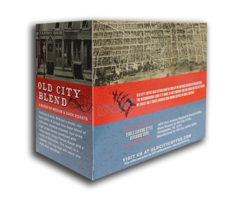 “Old City Blend” and the company itself are named for Old City, the colonial neighborhood known as the birthplace of American Independence. The coffee pod packaging uses colors and imagery to reflect this historical namesake.