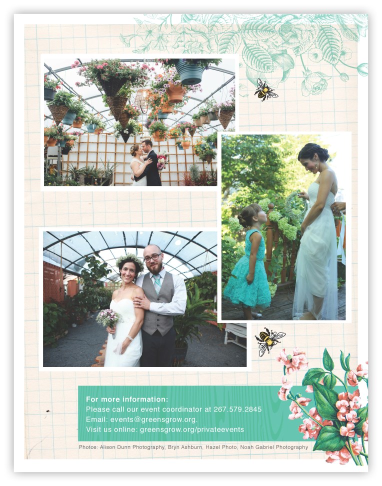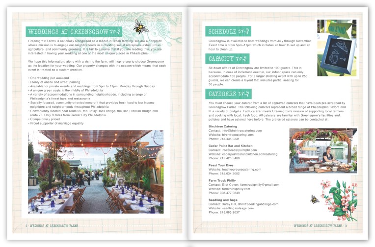 Informational materials to used online and at information points to help spread the word about weddings and private events at an urban farm and garden center in Philadelphia. Materials adapt a lighter take on the non-profit’s branding to appeal to event planners looking for an urban yet outdoorsy special event venue.